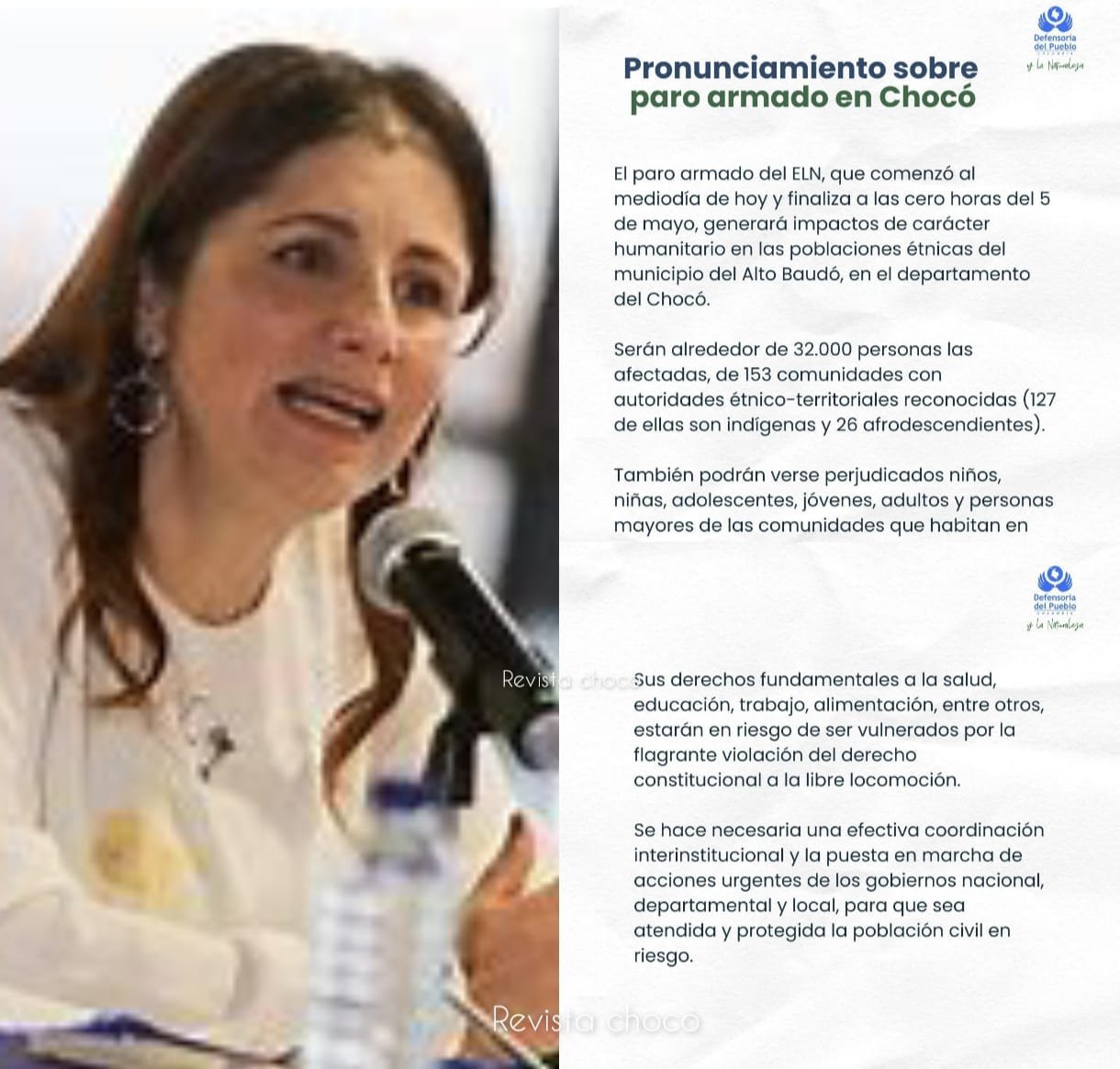 El paro armado del ELN, que comenzó al mediodía de hoy y finaliza a las cero horas del 5 de mayo, generará impactos de carácter humanitario en las poblaciones étnicas del municipio del Alto Baudó, en el departamento del Chocó.