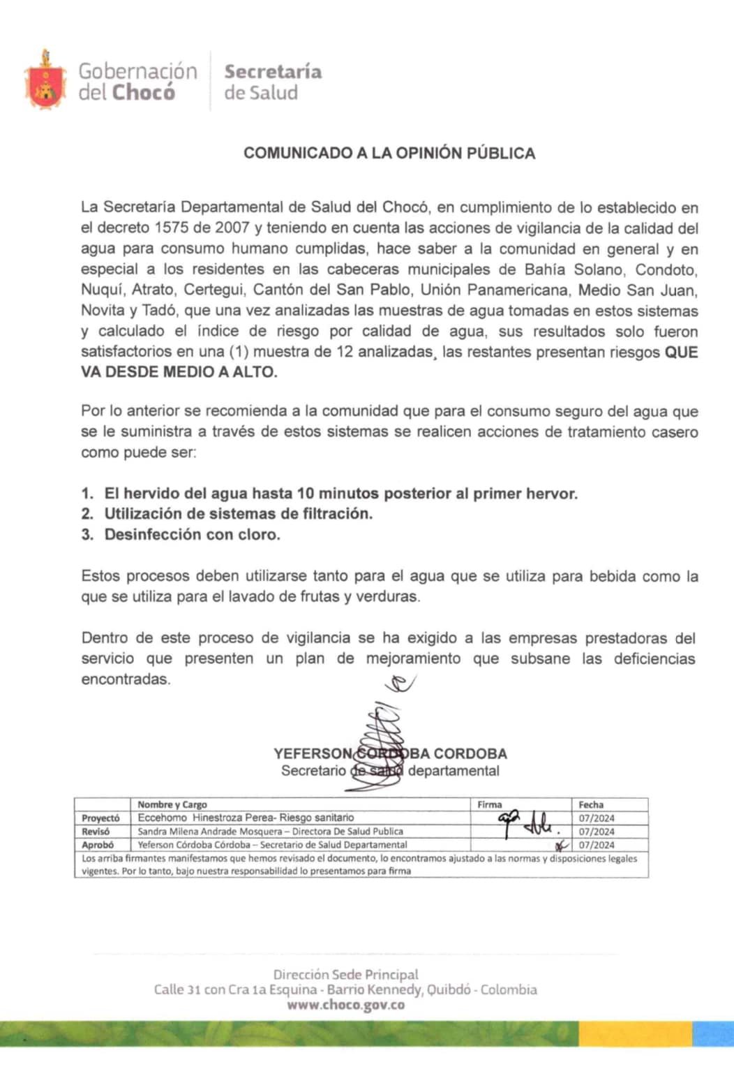 El departamento del Chocó enfrenta una grave crisis sanitaria, según revelaciones del Secretario de Salud Departamental, Yeferson Córdoba Córdoba. Un análisis exhaustivo ha confirmado que los municipios de Bahía Solano, Condoto, Nuquí, Atrato, Cértegui, Cantón del San Pablo, Unión Panamericana, Medio San Juan, Novita y Tadó están consumiendo agua que no cumple con los estándares de potabilidad.