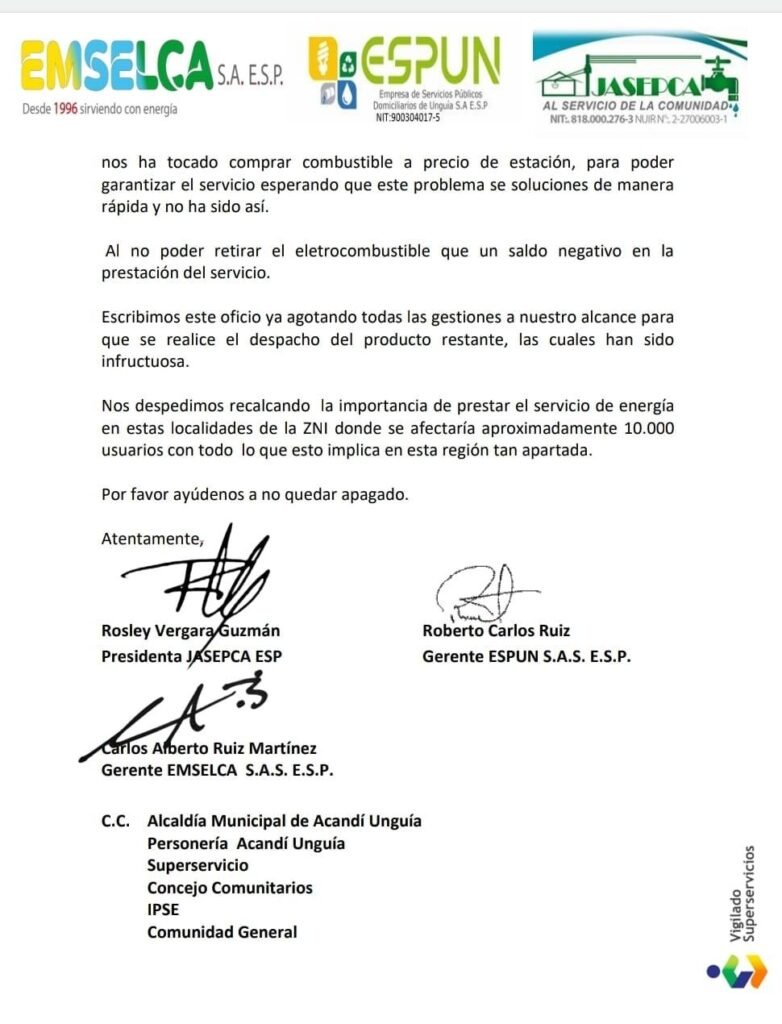 Los gerentes de las tres empresas afectadas —dos en Acandí y una en Unguía— alertan que están al borde de un apagón total debido a la escasez de diésel. La situación obligó a reducir las horas de servicio energético en un esfuerzo por conservar el poco combustible disponible. A pesar de los esfuerzos por manejar los recursos con eficiencia, la falta de respuesta efectiva del Ministerio amenaza con dejar a estas comunidades sin suministro eléctrico.