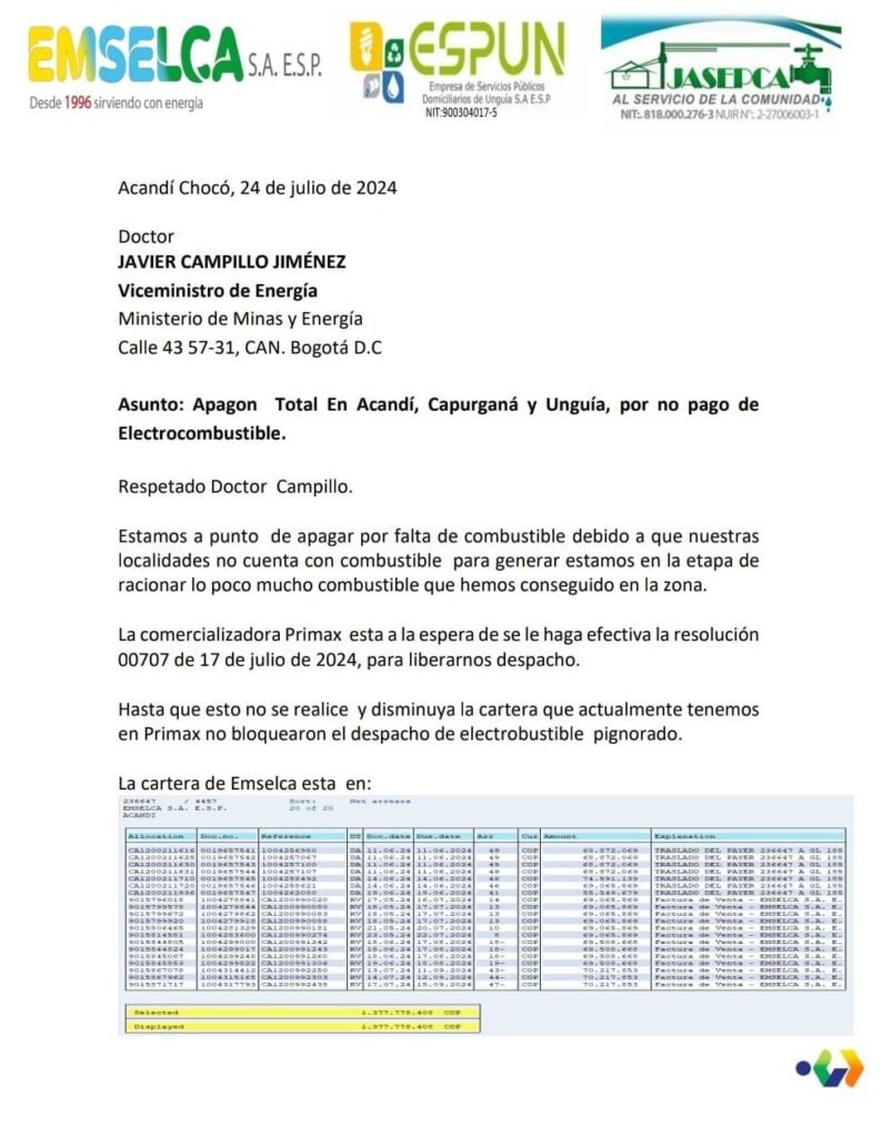 La situación exige una intervención urgente del gobierno nacional para resolver las deudas y restablecer el suministro de combustible, garantizando así la continuidad del servicio eléctrico en Acandí y Unguía.