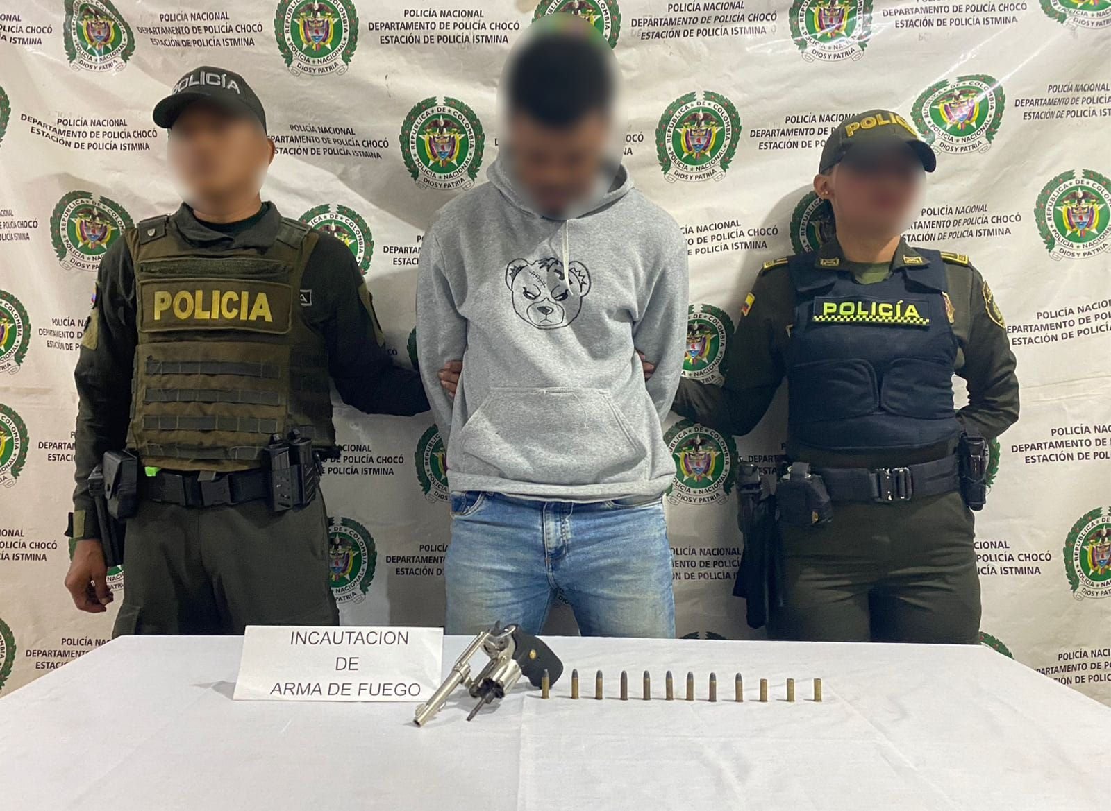 De inmediato se procedió a la incautación del arma y a la captura del ciudadano de 21 años, residente en Istmina, quien fue informado de sus derechos como persona capturada.
