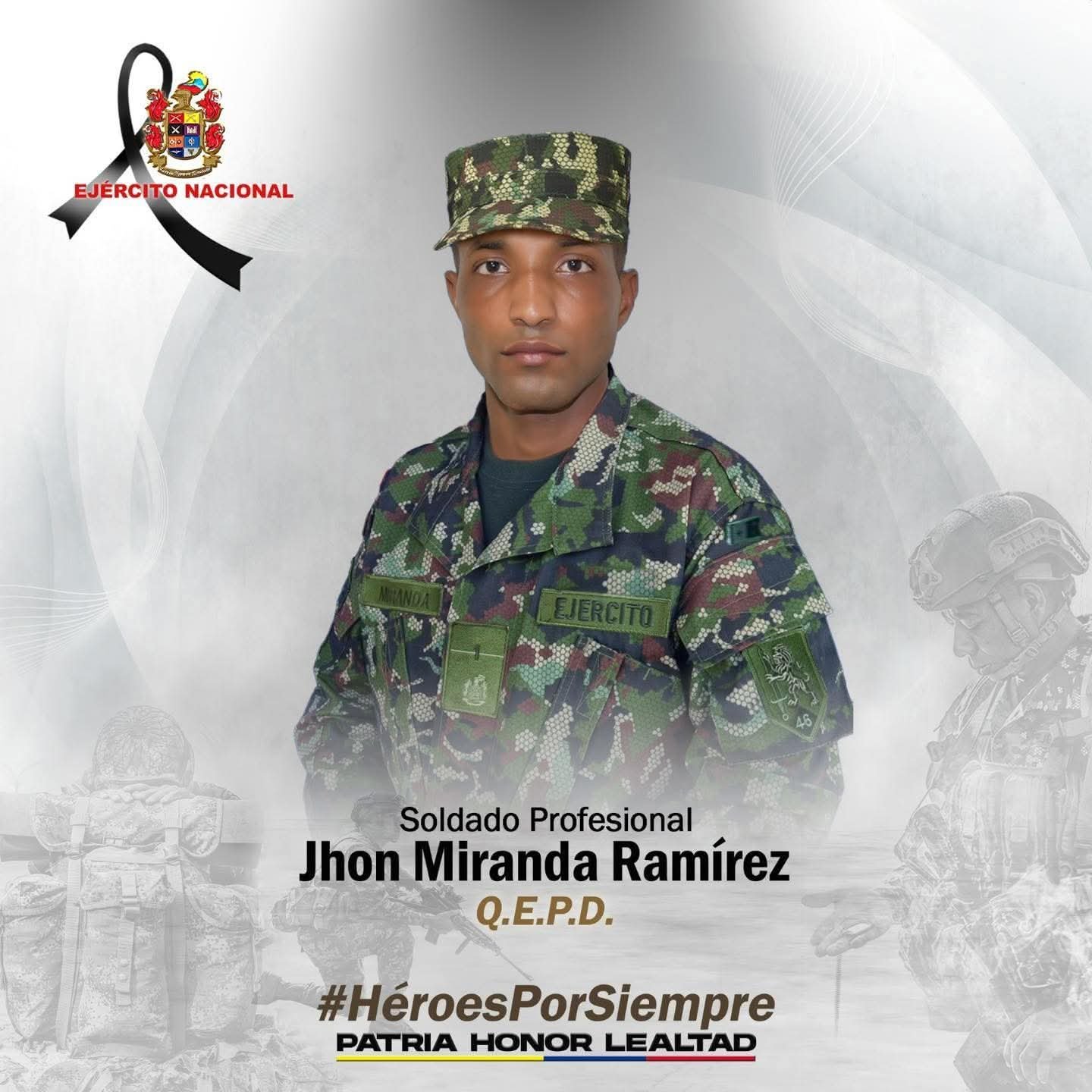 El pasado 26 de septiembre, el soldado profesional Jhon Miranda Ramírez perdió la vida tras activar una mina antipersonal instalada por el Grupo Armado Organizado Clan del Golfo, durante operaciones de estabilidad realizadas por el Ejército Nacional. El hecho ocurrió mientras protegía a los habitantes de esta zona afectada por el conflicto.