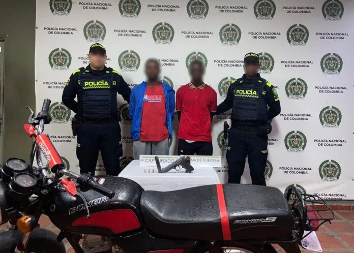 En la tarde del 03 de septiembre, en medio de labores de patrullaje sobre la carrera 4 con calle 26, unidades de la Policía Nacional detuvieron a dos sujetos que se movilizaban en una motocicleta bóxer sin placa. Al notar la actitud sospechosa de los individuos, los uniformados realizaron la señal de pare para efectuar un registro personal y consulta de antecedentes.