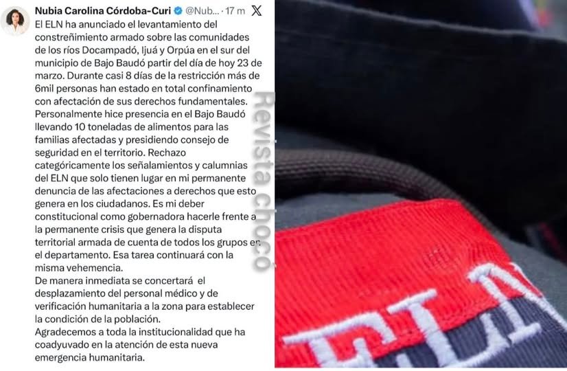 La gobernadora del Chocó, Nubia Carolina Córdoba-Curi, confirmó que ya se encuentra en marcha la reactivación progresiva de la vida social y económica en la zona, tras el anuncio del grupo armado. Además, rechazó enfáticamente los señalamientos del ELN, reiterando su compromiso con la defensa de los derechos humanos.