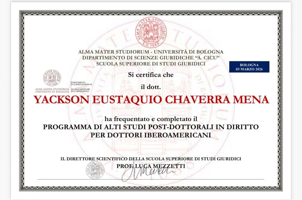 El fiscal y académico chocoano Yackson Eustaquio Chaverra Mena obtuvo su título posdoctoral en Derecho tras culminar una investigación en la Universidad de Bolonia, institución fundada en 1088 y considerada una de las universidades más antiguas del mundo. El estudio analiza los límites constitucionales del uso de tecnologías avanzadas en la justicia penal, particularmente herramientas de inteligencia artificial, machine learning y sistemas de análisis de datos aplicados al ámbito judicial.