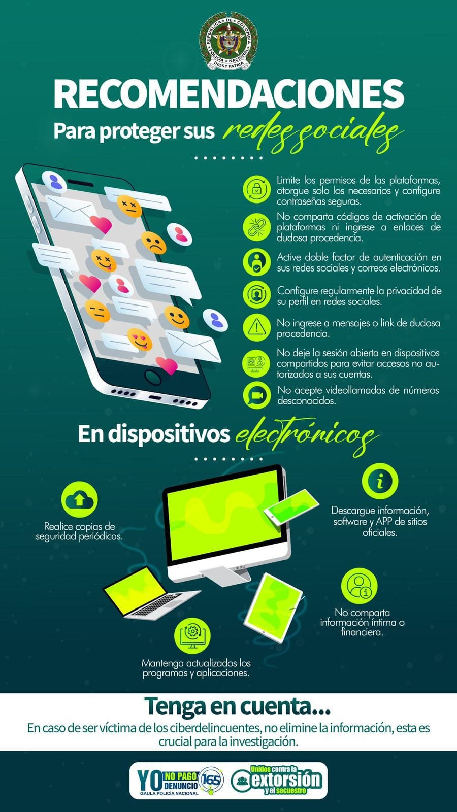 La Policía Nacional invita a denunciar cualquier intento de extorsión a través del aplicativo A Denunciar, disponible en www.policia.gov.co y www.fiscalia.gov.co, o llamando a la línea 165 Antisecuestro y Antiextorsión, disponible 24/7 en todo el país.
