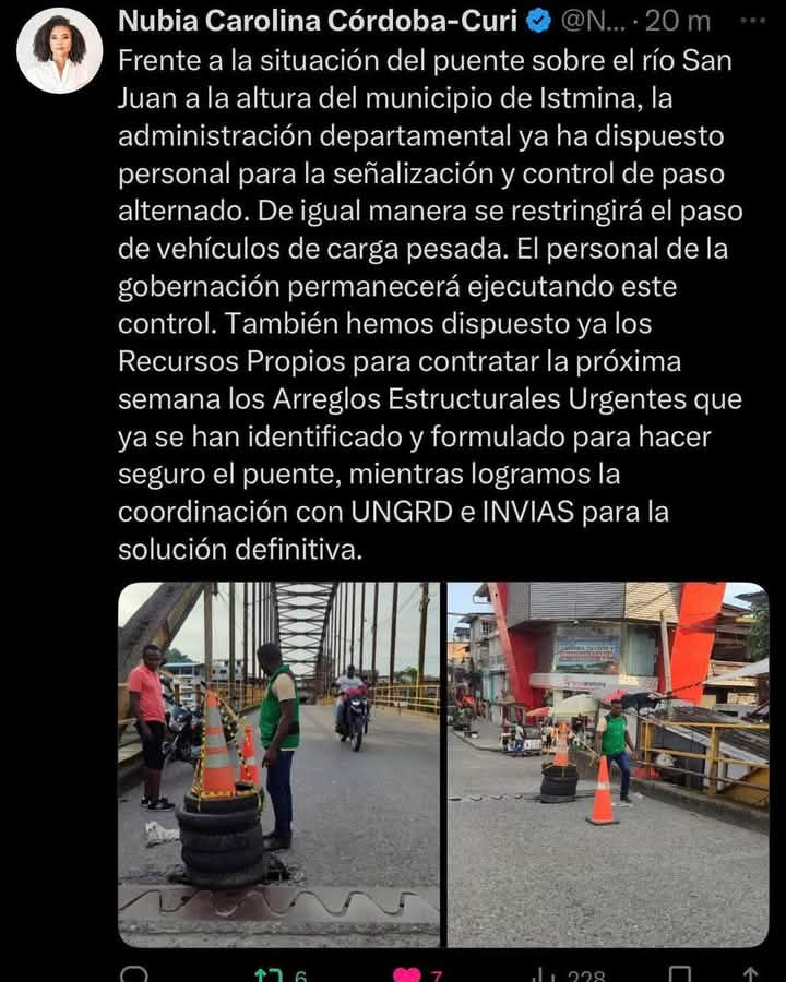 Ante la situación del puente sobre el río San Juan en Istmina, la administración departamental, liderada por Nubia Carolina Córdoba-Curi, ha dispuesto personal para señalización y control de paso alternado, restringiendo el paso de vehículos de carga pesada. Además, se han asignado recursos propios para iniciar arreglos estructurales urgentes la próxima semana, mientras se coordina una solución definitiva con UNGRD e INVIAS.