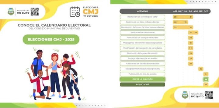 La Alcaldía Municipal de Río Quito ha publicado el calendario electoral oficial del Consejo Municipal de Juventud (CMJ) 2025, invitando a todos los jóvenes a participar activamente en este importante proceso democrático. El calendario incluye todas las fechas clave, desde la inscripción de candidatos hasta la jornada de votación, que se llevará a cabo el 19 de octubre de 2025. La publicación de los resultados está programada para el 20 de octubre de 2025.