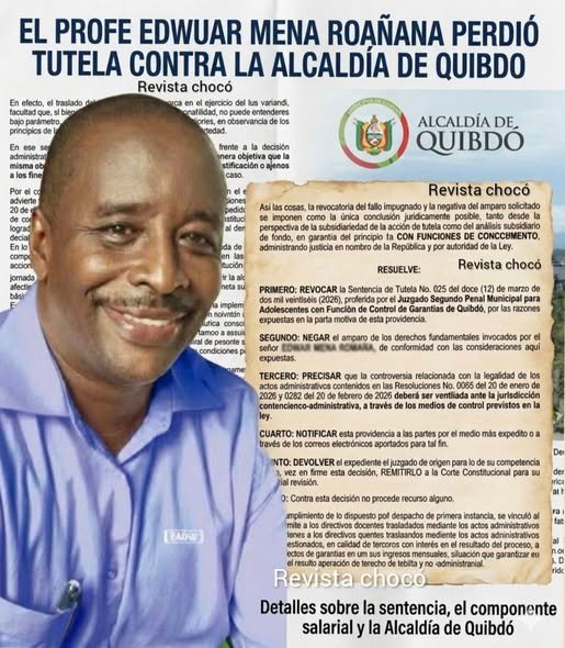 El Juzgado Primero Penal del Circuito para Adolescentes de Quibdó revocó en segunda instancia el fallo que favorecía al docente Edwar Mena Romaña y negó la acción de tutela interpuesta contra el Municipio de Quibdó. La decisión concluyó que no se evidenció vulneración de derechos fundamentales como el mínimo vital, el debido proceso o la estabilidad laboral.