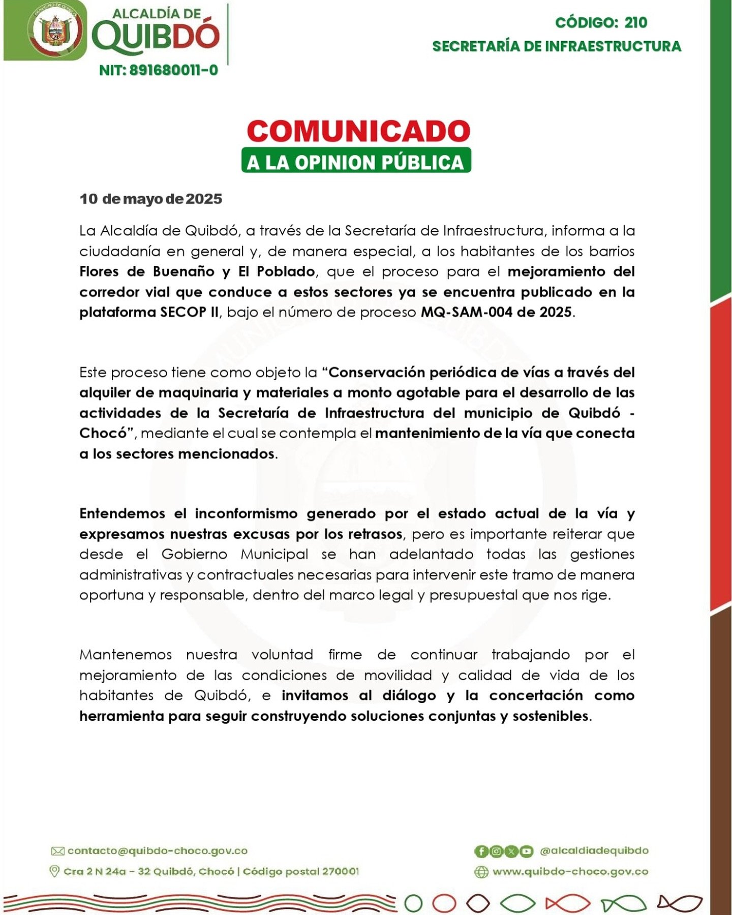 📌 @alcaldiadequibdo | 💼 @MinTransporteCo | 💻 [www.quibdo-choco.gov.co](http://www.quibdo-choco.gov.co)