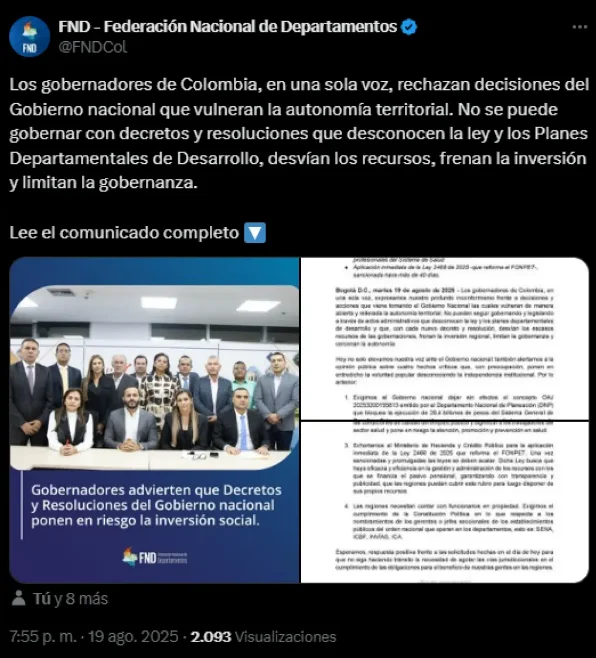 El gremio convocó a una mesa de trabajo urgente con el Gobierno Nacional. Los 32 gobernadores no solo exigen la derogatoria de las medidas cuestionadas, sino garantías reales de seguridad y control territorial, elementos indispensables para cualquier proceso de desarrollo regional.