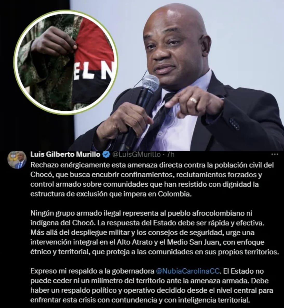 A través de su cuenta de X, Murillo rechazó el anuncio del ELN y lo calificó como una “amenaza directa contra la población civil del Chocó, que busca encubrir confinamientos, reclutamientos forzados y control armado sobre comunidades que han resistido con dignidad la estructura de exclusión que impera en Colombia”.