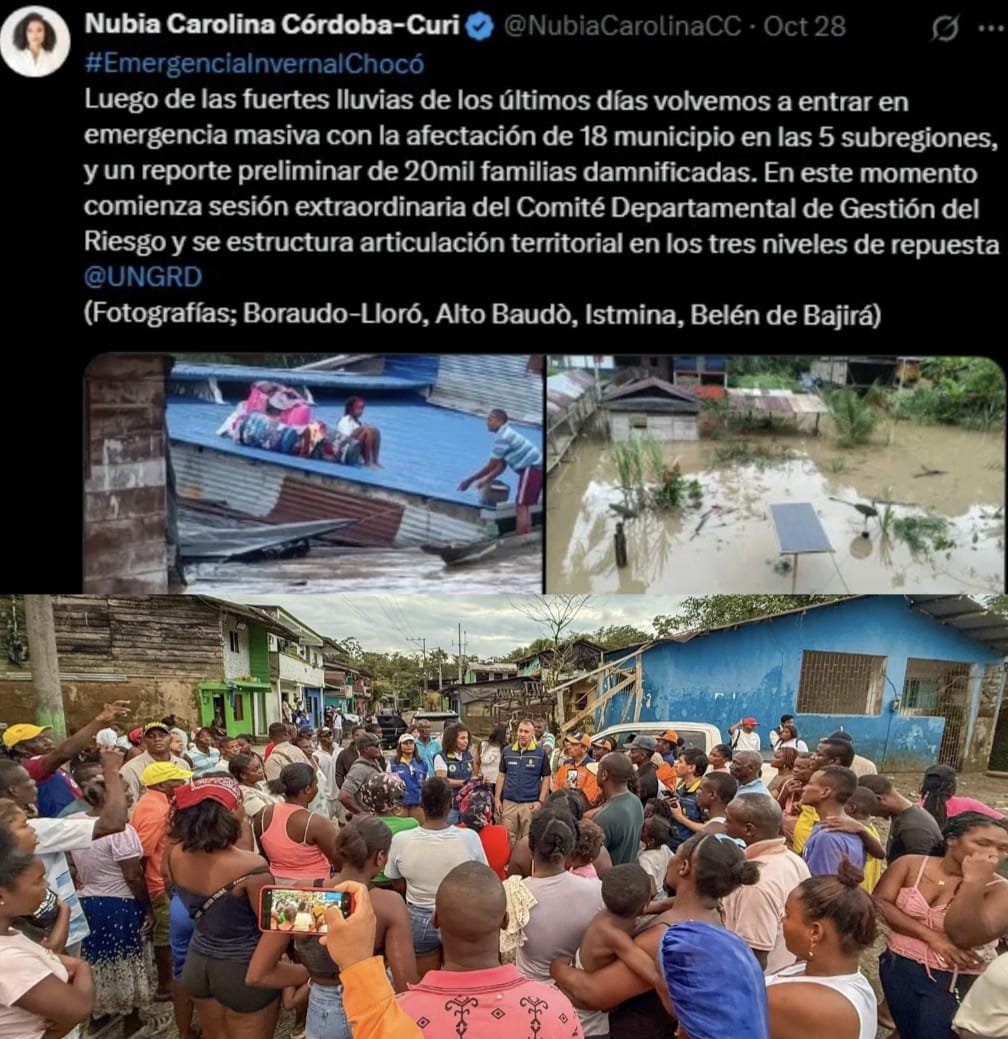 Según la Gobernadora del Chocó, Nubia Carolina Córdoba los municipios más afectados son Lloró, Alto Baudó, Istmina y Belén de Bajirá.