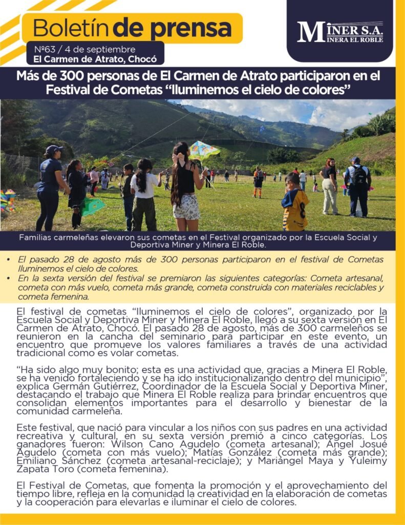 El festival de cometas “Iluminemos el cielo de colores”, organizado por la Escuela Social y Deportiva Miner y Minera El Roble, llegó a su sexta versión en El Carmen de Atrato, Chocó. El pasado 28 de agosto, más de 300 carmeleños se reunieron en la cancha del seminario para participar en este evento, un encuentro que promueve los valores familiares a través de una actividad tradicional como es volar cometas.