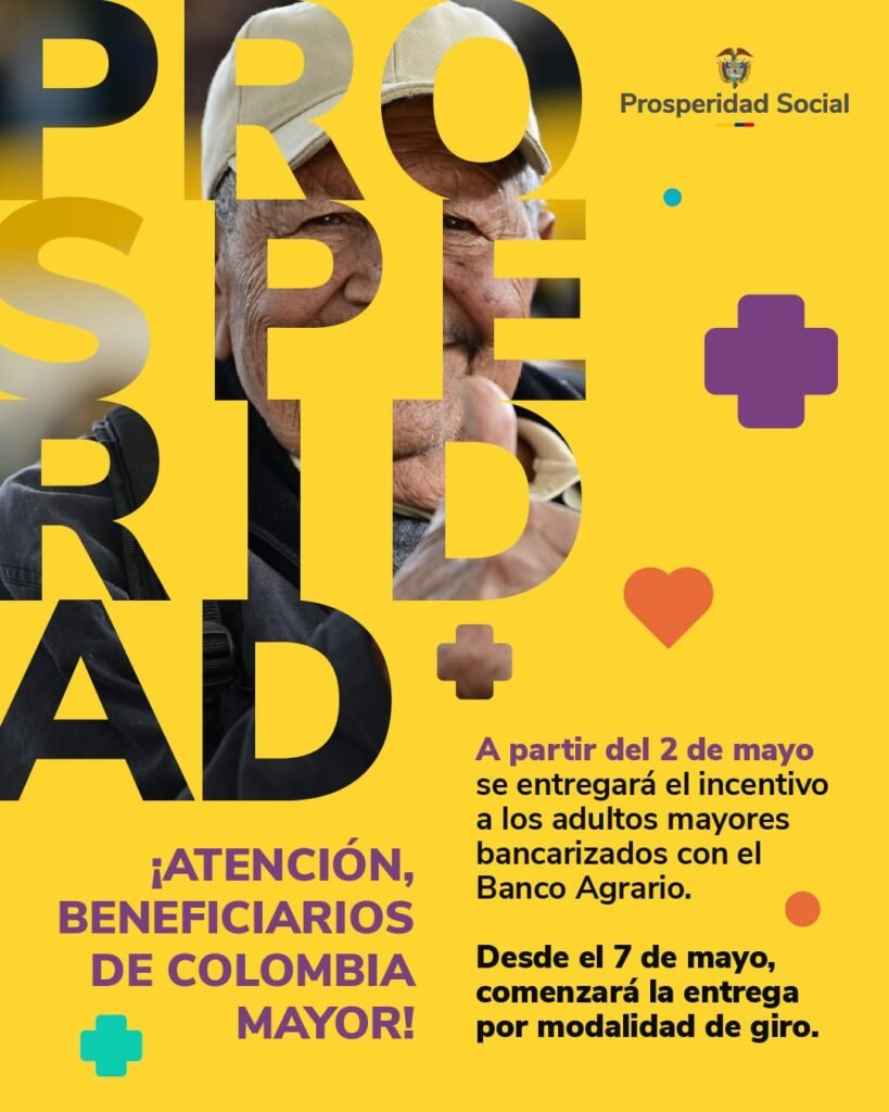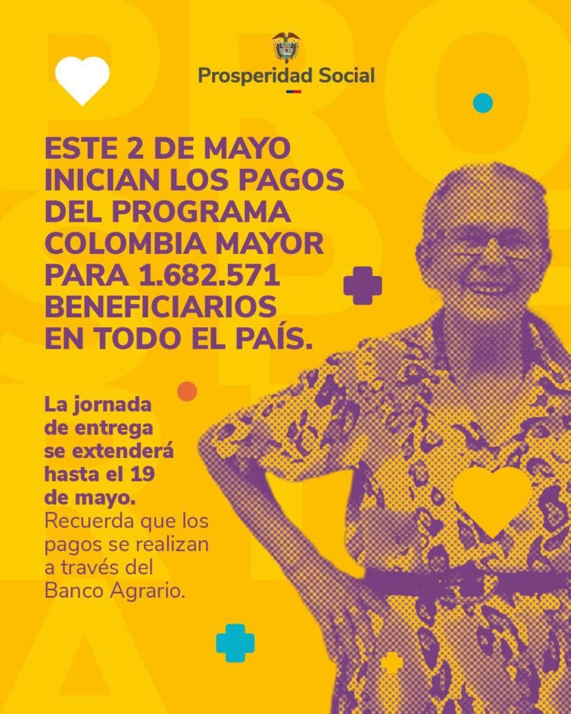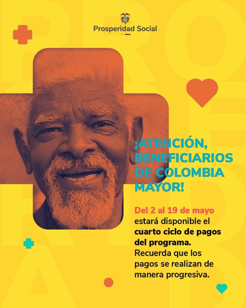 La entrega de los recursos comenzará a partir del 2 de mayo e irá hasta el 19 de mayo de 2025. El director de Prosperidad Social, Gustavo Bolívar Moreno, anunció que la entidad entregará, del 2 al 19 de mayo, los pagos del cuarto ciclo del año del programa Colombia Mayor.