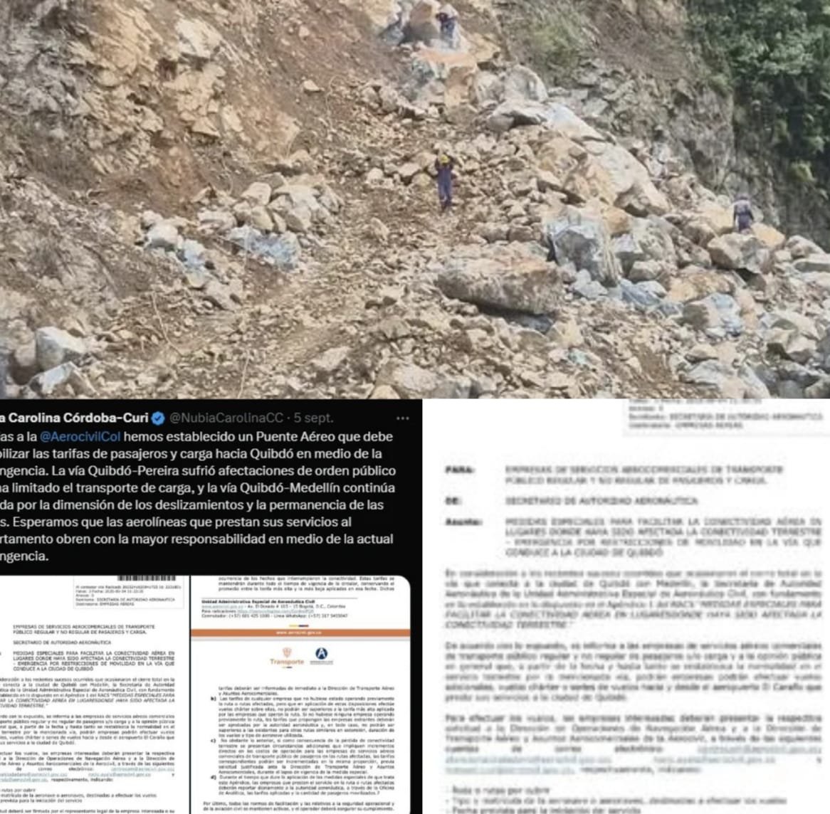 Ante la grave situación de conectividad terrestre que afecta al Chocó, la Gobernadora Nubia Carolina Córdoba anunció la activación de un Puente Aéreo en articulación con la @AerocivilCol, con el fin de garantizar el transporte de pasajeros y carga hacia Quibdó. Las vías Quibdó-Medellín y Quibdó-Pereira presentan cierres y restricciones debido a deslizamientos y problemas de orden público.