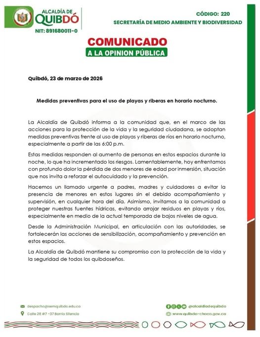 La Alcaldía de Quibdó anunció la adopción de medidas preventivas para el uso de playas y riberas en horario nocturno, con el objetivo de proteger la vida y la seguridad de la ciudadanía en Quibdó.