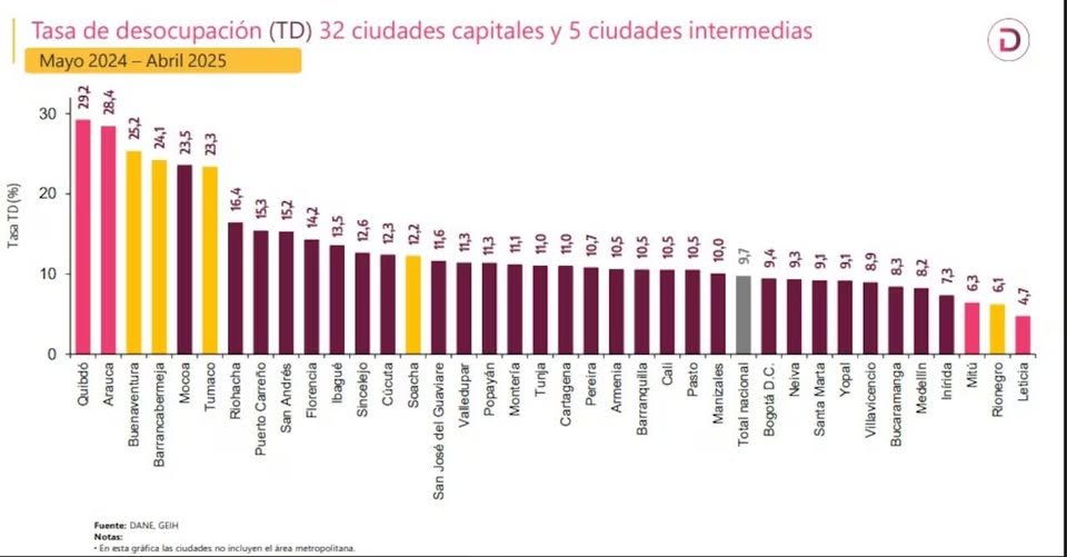 Aunque en términos generales los indicadores muestran una mejora, con cinco ciudades grandes ubicándose por debajo del 9 % de desempleo entre ellas Medellín (7,8 %), Villavicencio (8 %), Santa Marta (8,7 %), Bucaramanga (8,8 %) y Bogotá (8,9 %), la brecha regional se profundiza.