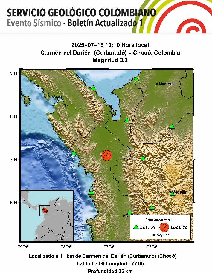 El punto central de este fenómeno natural se reportó a Carmen del Darién (Curbaradó), con una profundidad de 35 kilómetros.