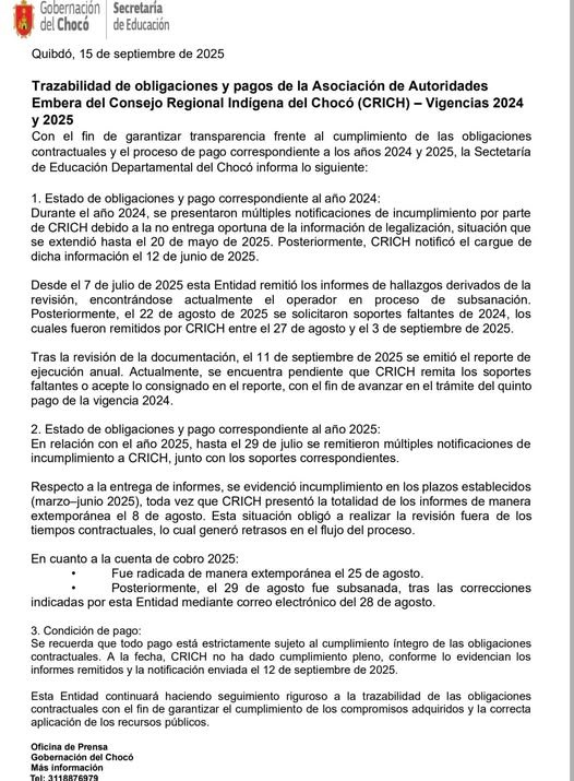 La Gobernación del Chocó, a través de la Secretaría de Educación, emitió un comunicado detallando el estado de las obligaciones contractuales y los pagos realizados a la Asociación de Autoridades Embera del Consejo Regional Indígena del Chocó (CRICH) para las vigencias 2024 y 2025. El informe busca garantizar la transparencia en el uso de los recursos públicos.