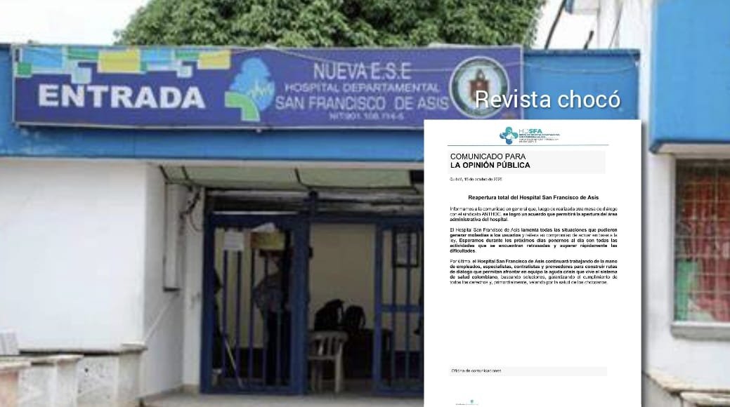 Tras semanas de tensiones y suspensión de actividades, el Hospital Departamental San Francisco de Asís (HDSFA) en Quibdó anuncia su reapertura total, incluyendo el área administrativa, luego de llegar a un acuerdo definitivo con el sindicato ANTHOC. Este importante avance se logró tras una nueva mesa de diálogo que demuestra el poder de la concertación frente a las crisis.
