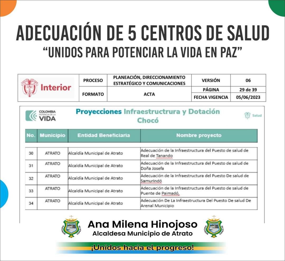 Se espera que estos proyectos no solo mejoren la atención médica local, sino que también fortalezcan el bienestar general de todos los habitantes del municipio de Atrato.