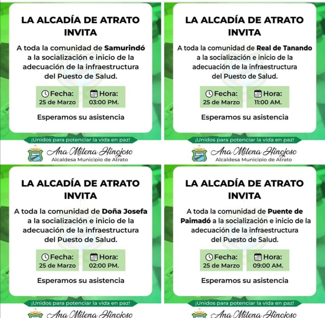 La Alcaldía de Atrato ha anunciado el inicio de un importante proyecto para mejorar la infraestructura de los puestos de salud en varias comunidades del municipio. Las localidades de Samurindó, Doña Josefa, Real de Tanandó y Puente de Paimadó serán las primeras en beneficiarse de estas adecuaciones, que buscan fortalecer los servicios de salud para los habitantes. Para dar inicio al proceso, la alcaldía invita a las comunidades a participar en las socializaciones que se llevarán a cabo el próximo 25 de marzo en cada uno de estos lugares, a distintas horas del día.