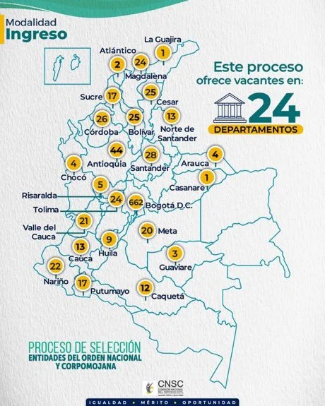 Los cargos están distribuidos en 24 departamentos del país, siendo Bogotá el que concentra la mayoría de las vacantes (662), seguido de Antioquia, Córdoba, Bolívar y Santander. También hay plazas disponibles en departamentos como Chocó, Putumayo, La Guajira, Nariño y Meta. Todos los detalles sobre los requisitos, funciones y el proceso de inscripción están disponibles en [www.cnsc.gov.co](https://www.cnsc.gov.co) y en la plataforma oficial [https://simo.cnsc.gov.co](https://simo.cnsc.gov.co).